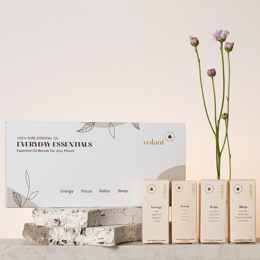 Everyday Essentials Set är ett paket med våra fyra mest populära blandningar: Energy, Relax, Sleep och Focus. Setet har en arom för varje situation och är det perfekta startpaketet, oavsett om du behöver mer vila, sömn, energi, eller fokus. Du sparar över 100 kr när du köper detta set.