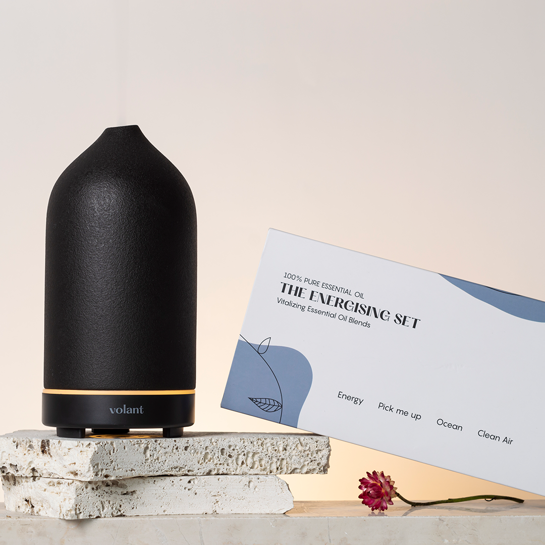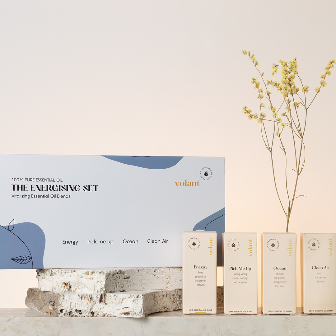 volant Energising Essential Oil Set flaskor och förpackningar. Fylld med våra bästa energiboosters: Energy, Pick Me Up, Ocean och Clean Air. Perfekt verktyg för att få igång dig.